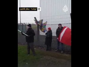 نظم ناشطون احتجاجا بمطار شانون، في أيرلندا، رفضا لمرور طائرات أمريكية إلى إسرائيل.