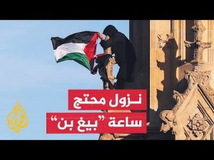 وفي لندن، تمكنت الشرطة البريطانية من إقناع محتج رفع العلم الفلسطيني على برج ساعة بيغ بن الشهيرة بالنزول من البرج بعد اكثر من سبع عشرة ساعة. وقد تسلق الرجل البرج الواقع داخل قصر البرلمان بعد شروق شمس السبت بقليل حاملا العلم الفلسطيني وهاتفا بالحرية وظل عليه حتى بعد منتصف الليل. ونشر الرجل عدة منشورات على الإنترنت قال فيها إن فعله جاء احتجاجا على قمع الشرطة للمظاهرات المؤيدة للحقوق الفلسطينية وعلى ما وصفها بفاشية الحكومة التي تستمر في تزويد إسرائيل بالسلاح.