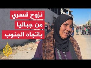 يجبر جيش الاحتلال الإسرائيلي النازحين في مراكز الإيواء بمحيط المستشفى الإندونيسي بمخيم جباليا شمالي قطاع غزة على النزوح قسرا تجاه مدينة غزة عبر شارع صلاح الدين.