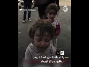 مشهد مؤثر لطفلة فلسطينية تبكي من الجوع أثناء انتظارها وسط طوابير النازحين للحصول على الطعام