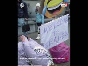 وبجواره لافتة تحمل رمزًا تعبيريًا ضاحكًا، وكُتب عليها باللغة الإنجليزية "Welcome to IsraHell"، في إشارة إلى التحقيق الذي كشفته منظمة بتسيلم الإسرائيلية والذي يحمل عنوان "مرحبا بك في الجحيم"، ويتحدث عن الانتهاكات والمعاملة غير الإنسانية للفلسطينيين المحتجزين لدى إسرائيل منذ 7 أكتوبر 2023.