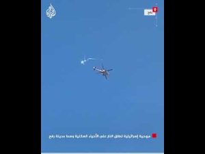 أظهرت مشاهد بثها ناشطون فلسطينيون وصحفيون عل مواقع التواصل الاجتماعي، مروحية عسكرية إسرائيلية تطلق النار بشكل مكثف على الأحياء السكنية وسط مدينة رفح