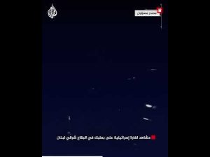 بث ناشطون ومنصات محلية لبنانية، مشاهد قالوا إنها للحظة القصف الإسرائيلي الذي استهدف بعلبك في البقاع شرقي لبنان. وتظهر المشاهد لحظة القصف والانفجار الناجم عنه. وقالت وكالة الأنباء اللبنانية إن الطيران الحربي الإسرائيلي قصف بصاروخين، جرود بلدة "قلد السبع"، إحدى مزارع آل مشيك غربي بعلبك.