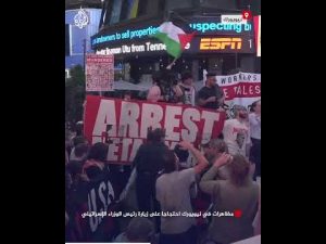 تظاهر مئات الناشطين الداعمين للقضية الفلسطينية، بمن فيهم أعضاء منظمة قدامى المحاربين من أجل السلام ومنظمات أخرى، في مدينة نيويورك، للاحتجاج على زيارة رئيس الوزراء الإسرائيلي بنيامين نتنياهو، وخطابه أمام الجمعية العامة للأمم المتحدة. وتُظهر اللقطات المتظاهرين وهم يهتفون ويقرعون الطبول ويحملون أعلام فلسطين، وهم يتجمعون بالقرب من ميدان تايمز سكوير. كما يمكن رؤيتهم وهم يحملون لافتات، بما في ذلك لافتة كتب عليها "اعتقلوا نتنياهو".